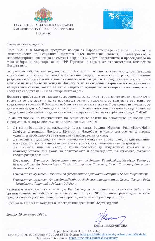 Инициативата за откриване на допълнителни изборни секции в Германия е подкрепена официално от посолството в Берлин, в писмото на посланик Елена Шекерлетова от 10 декември 2020 година: