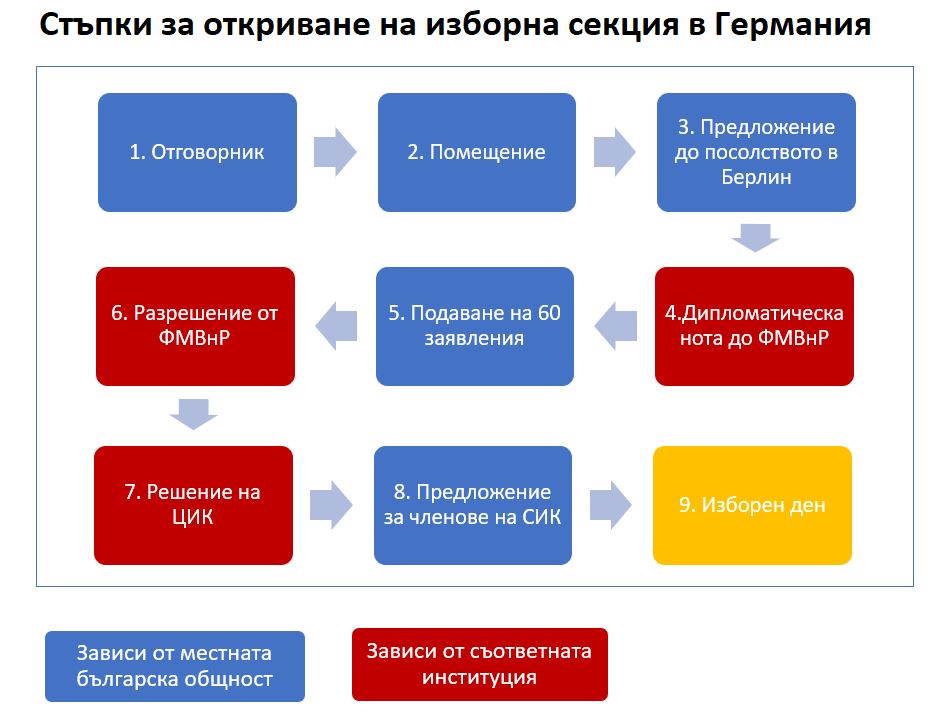 За да бъдат създадени достатъчно на брой удобни изборни секции в Германия, е необходима най-напред инициатива на доброволци от местните български общности.
