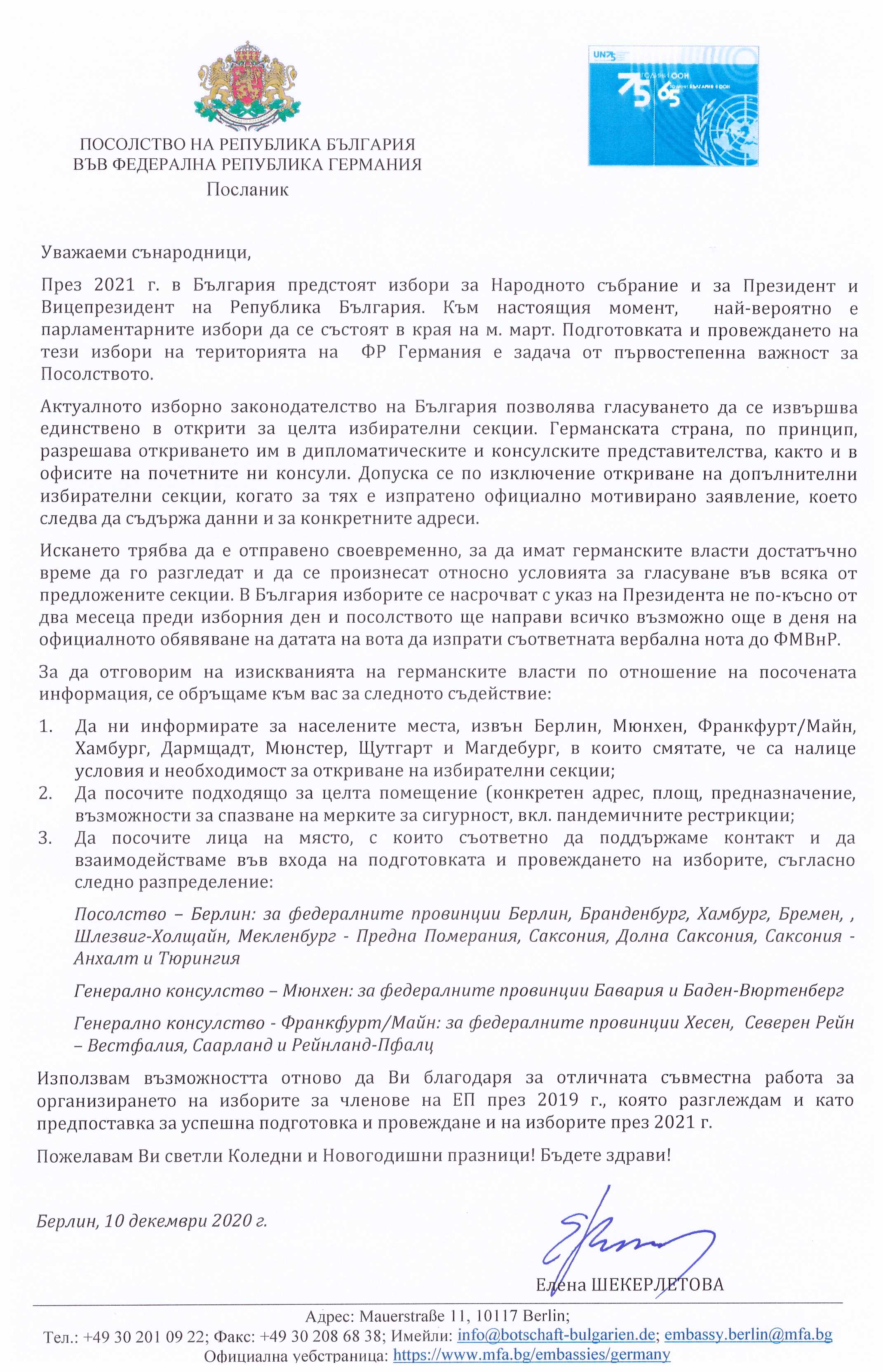 Инициативата за откриване на допълнителни изборни секции в Германия е подкрепена официално от посолството в Берлин, в писмото на посланик Елена Шекерлетова от 10 декември 2020 година: