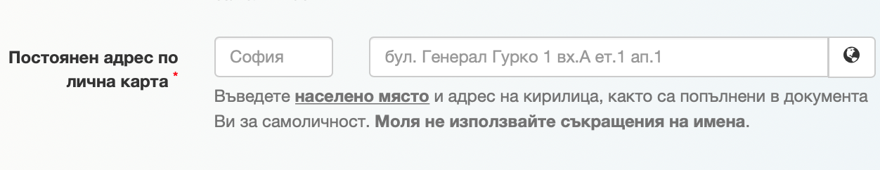 Внимание! Въведете данните за постоянния адрес точно както е написан в личната Ви карта (със запетайки, точки, тирета и празни места). Това е най-чувствителният текст за въвеждане, за да бъде заявлението Ви успешно прието от системата. В противен случай излиза съобщение за грешка „Адресът не съвпада с данните от Национална база данни „Население“.